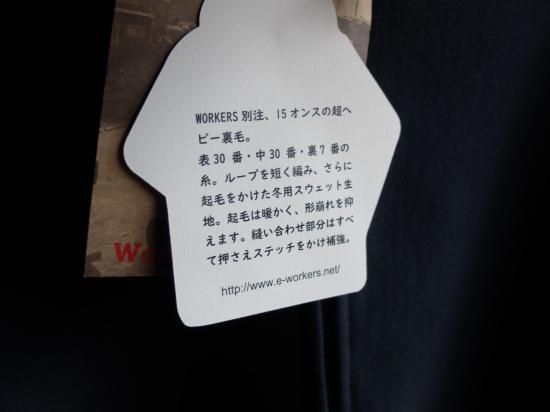 本家は化繊入り・カサッとしたスウェット生地に対し、WORKERS は表30番・中30番・裏7番の綿100。裏の糸ループを短く編み、 さらに起毛をかけた本格的冬用スウェットです。